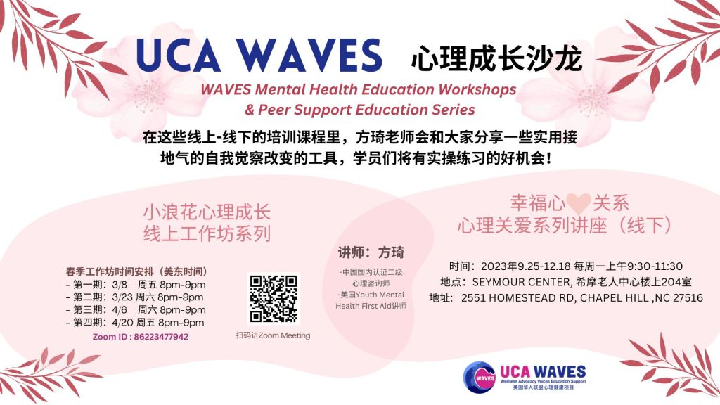 WAVES ran a well-attended weekly in-person seminar series titled “Make Relationships More Loving” led by Ms. Qi Fang at the Seymour Center in Chapel Hill, NC. The third session kicked off in Jan. 2024 and focused on exploring one’s subconsciousness.