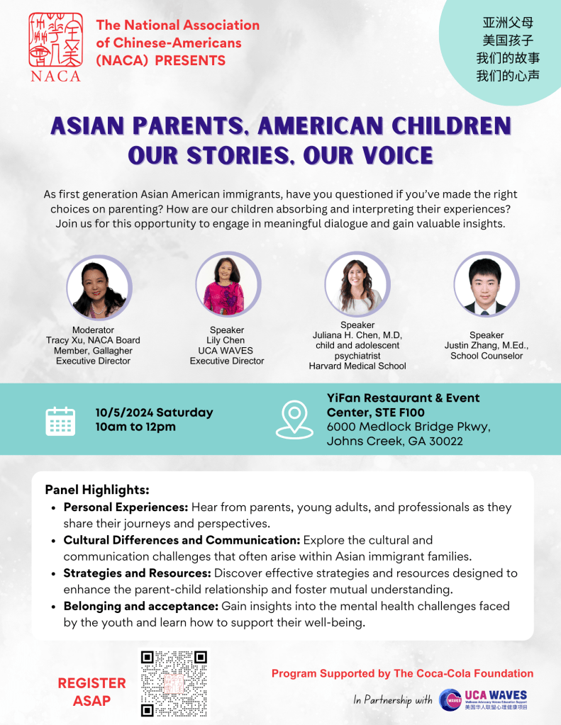 If you are an Atlanta resident, do not miss this Mental Health Conference on October 5! @NACA_Atlanta, in partnership with UCA WAVES, will host a dialogue in Johns Creek, GA with the theme of “Asian Parents, American Children–Our Stories, Our Voice” to promote mental health in the AANHPI community. Scan the barcode in the poster to sign up for the event!