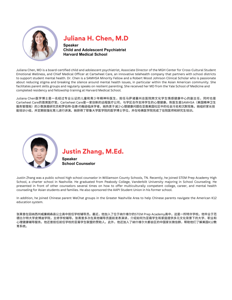 如果您住在亚特兰大,请不要错过这个活动!10月5日,在乔治亚州亚特兰大附近的Johns Creek,NACA (The National Association of Chinese-Americans)将举办一场旨在促进亚太裔(AANHPI)社区精神健康的活动(UCA WAVES协办)——一场主题为“亚裔父母,美国孩子;我们的故事,我们的心声”的现场对话。扫海报中的二维码即可报名。