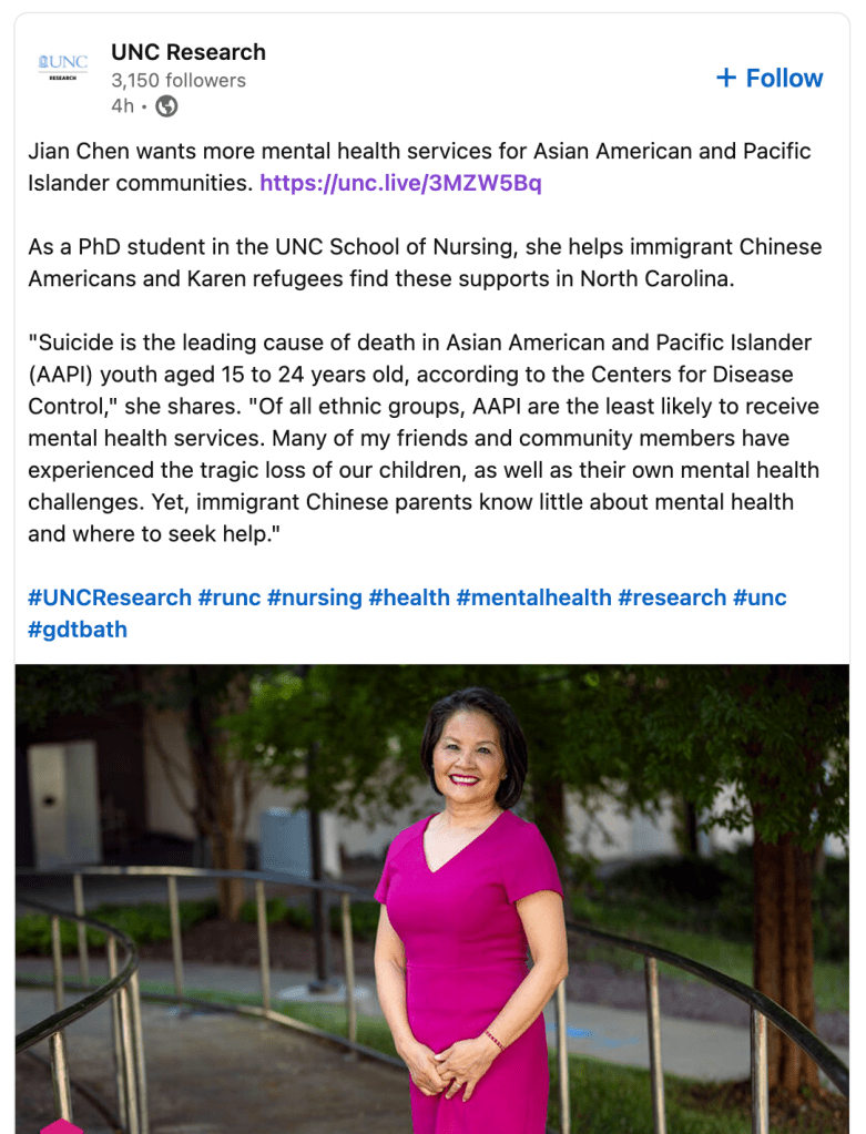University of North Carolina – Chapel Hill has published UCA WAVES founder and executive director, UNC PhD student Lily Chen’s story in UNC Research to help amplify AAPI voices.