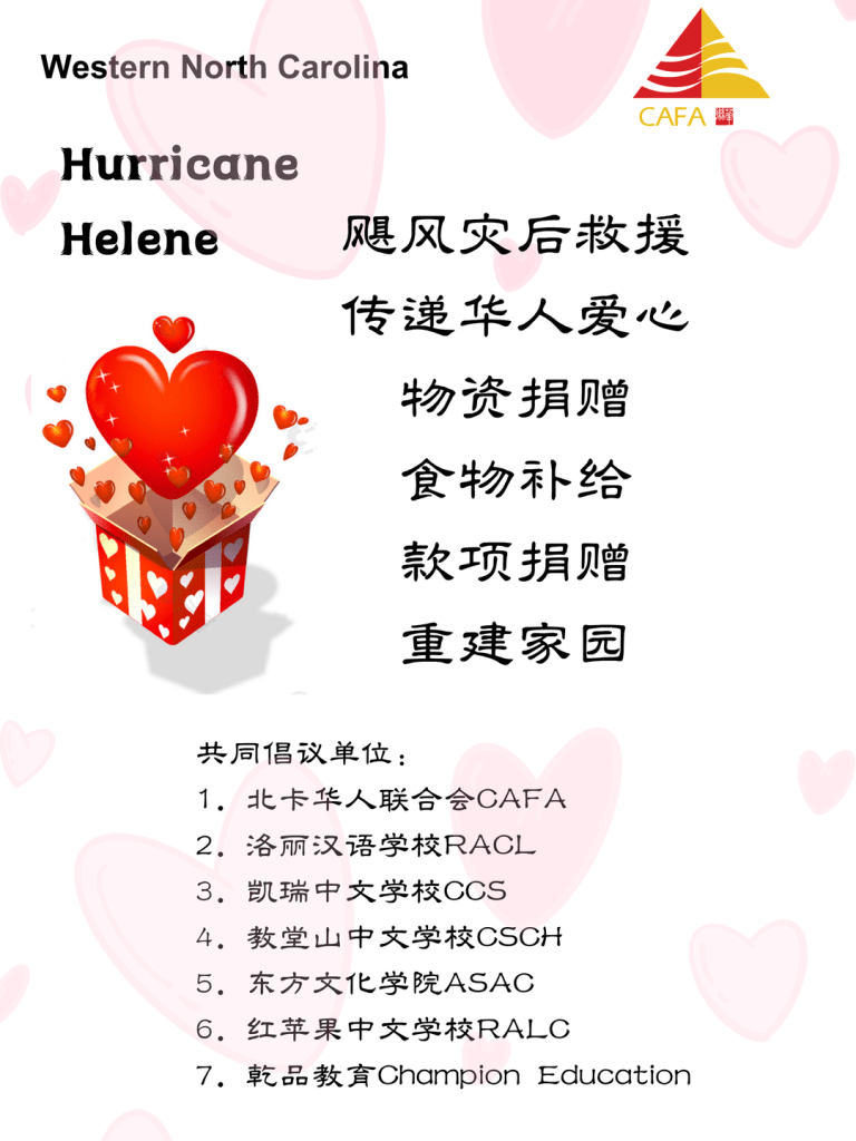 在这艰难的时刻,北卡华人联合会(CAFA)联合北卡25个华人社团,呼吁华人同胞伸出援手,捐资捐物,为灾区居民提供紧急帮助,为北卡西部灾区的重建贡献一份力量,帮助他们重拾希望,重建美好家园!
