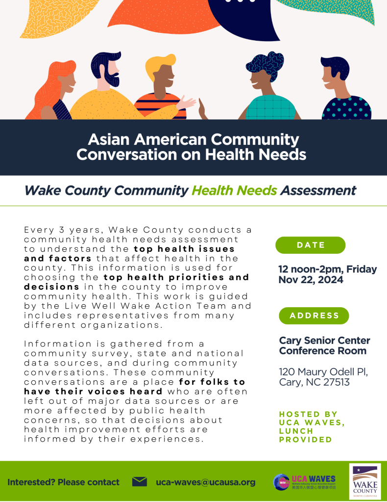 North Carolina Wake County will hold a listening session /conversation for community health assessment on Nov 22, Friday, 12pm-2pm at Cary Senior Center (address see flyer). Lunch provided. Please contact uca-waves@ucausa.org if you are interested.