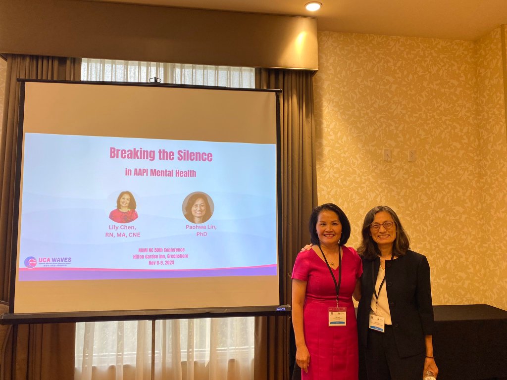 NAMI NC年会于11月8日至9日在北卡罗来纳州格林斯博罗举行,以庆祝其成立40周年!UCA WAVES的创始执行长陈健,杜克医学院教授、UCA WAVES志愿者研究员林宝华应邀在其中一个会议上发表演讲,主题为“打破AAPI社区关于心理健康话题的沉默”。