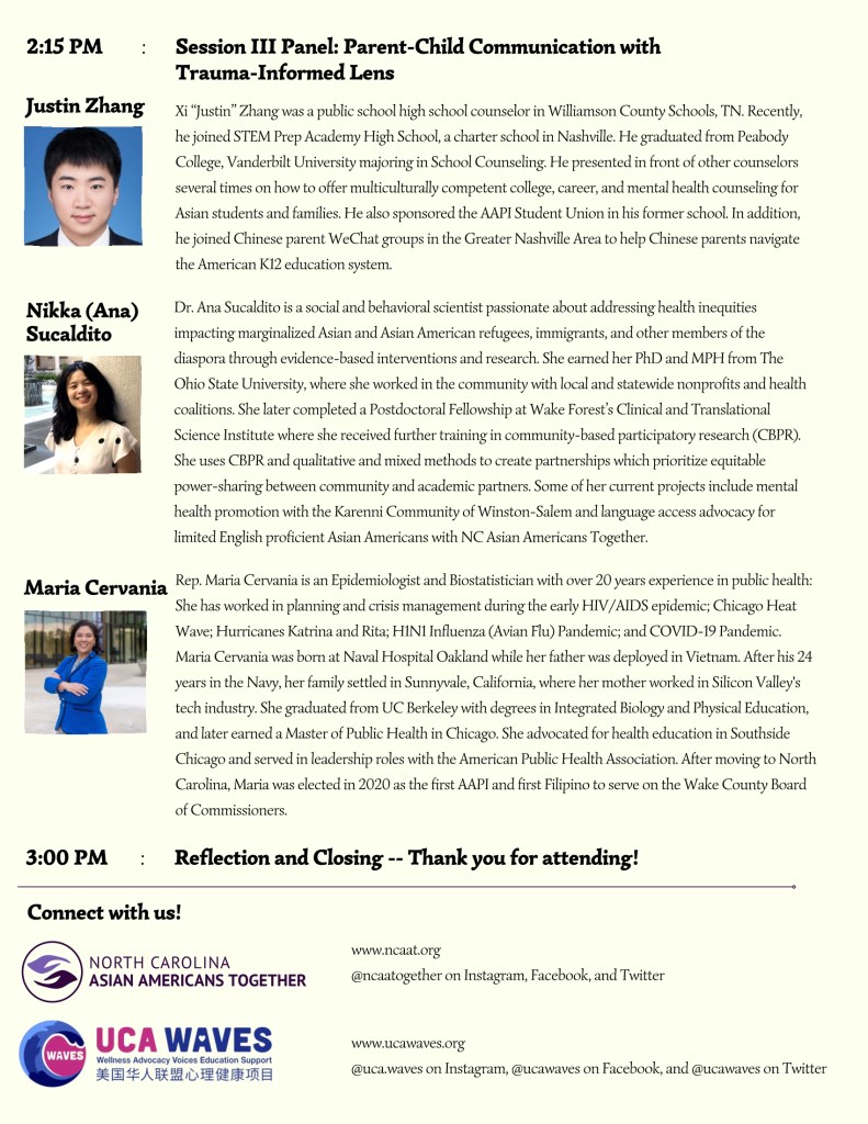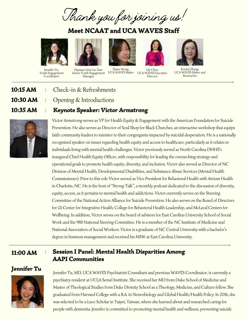 Organizing a hybrid event that prioritizes both safety and open dialogue is not easy, but UCA WAVES and NCAAT successfully brought this vision to life. The workshop not only deepened the audience’s understanding of AANHPI mental health but also underscored the importance of creating platforms for connection and learning. This event marks not merely the first step but an essential one of what we strive to promote: mental health awareness and equity within the AANHPI community.