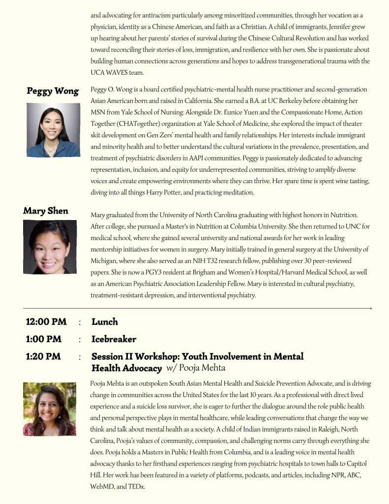 In the first session of the WAVES x NCAAT conference, three panelists—Jennifer Tu, Mary Shen, and Peggy Wong—shared their experiences as Asian women in psychiatry and discussed why they chose to work in mental health care. Jennifer studied neurobiology in college, and after she lost a friend to suicide when they were both sophomores, Jennifer became passionate about mental health and decided to help people who are struggling mentally by becoming a psychiatrist. Mary was trained in general surgery for five years, during which she performed multiple surgeries for patients whose need for surgery stemmed from mental health challenges: one of her patients needed gastrointestinal surgery due to an eating disorder. She pivoted to psychiatry hoping to address these problems at their root cause: mental health. Peggy has struggled with her learning disability since she was younger, and her experience led her into psychiatry, aiming to help more people who are struggling as she was. During the panel, all the panelists shared how their upbringing as Asian immigrants lent them a culture-sensitive lens when practicing psychiatry. Peggy shared a story about when she was working in an inpatient psych-ward, she had a young asian teen in the unit whose parents sat on different sides of the room and acted cold and distant from their child. She emphasized that although she understands that these parents are confused and hurt as well, she wishes that through more education and destigmatization, Asian parents can be more loving and warm to their children, especially when they are struggling mentally. Besides their own experience, panelists also shared some data regarding AAPI youth mental health. They brought up the alarming increase in AAPI teen suicide rate, agreeing that we need more research and funding put into promoting mental wellness for the AAPI population.