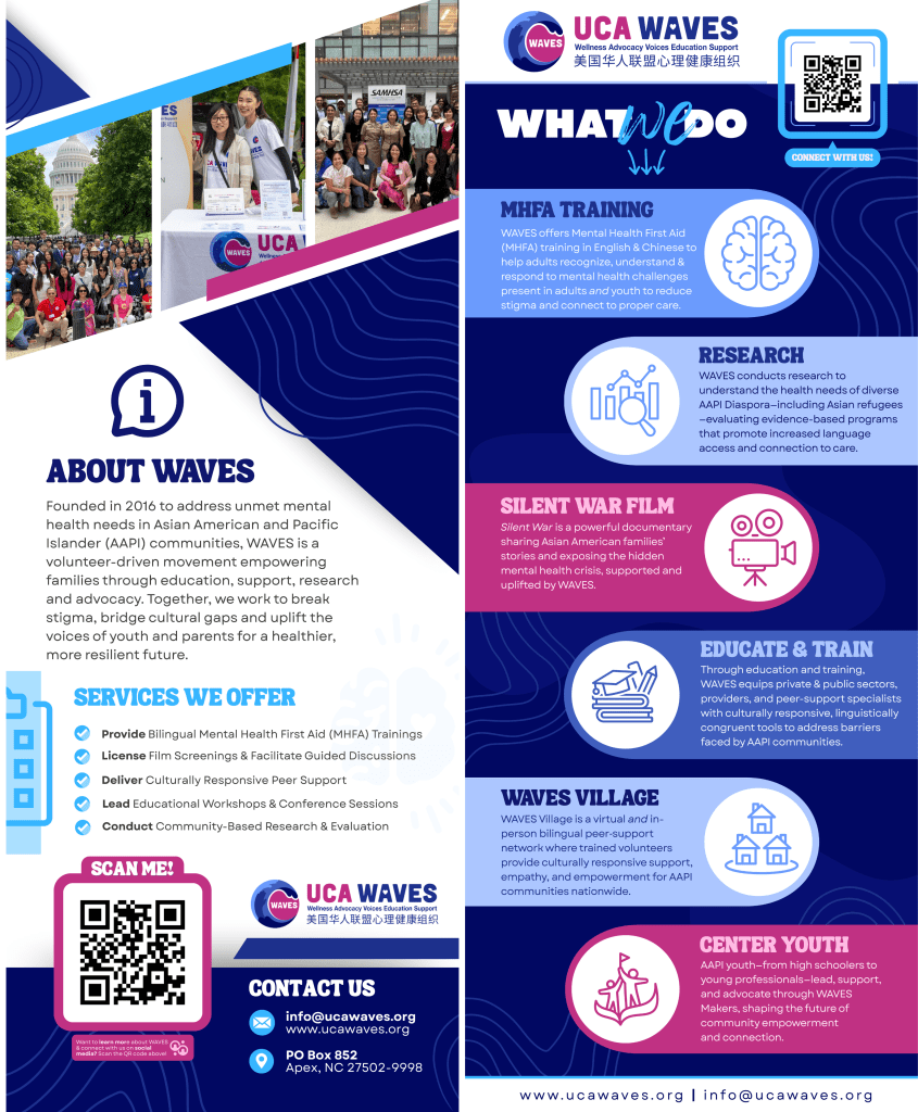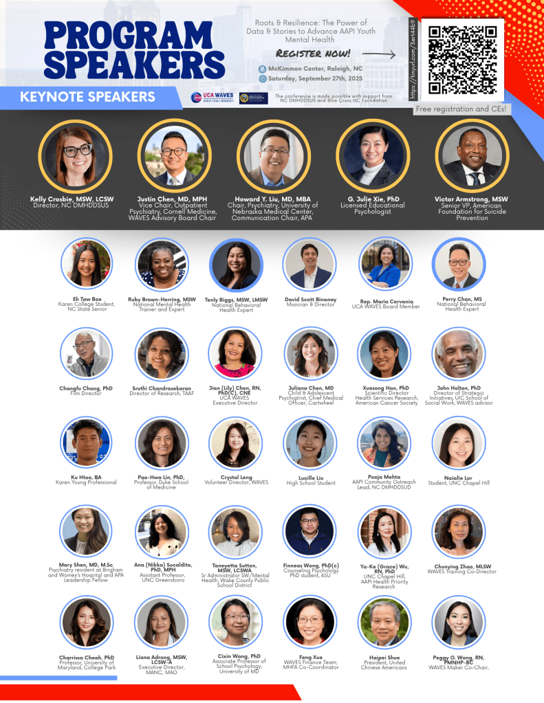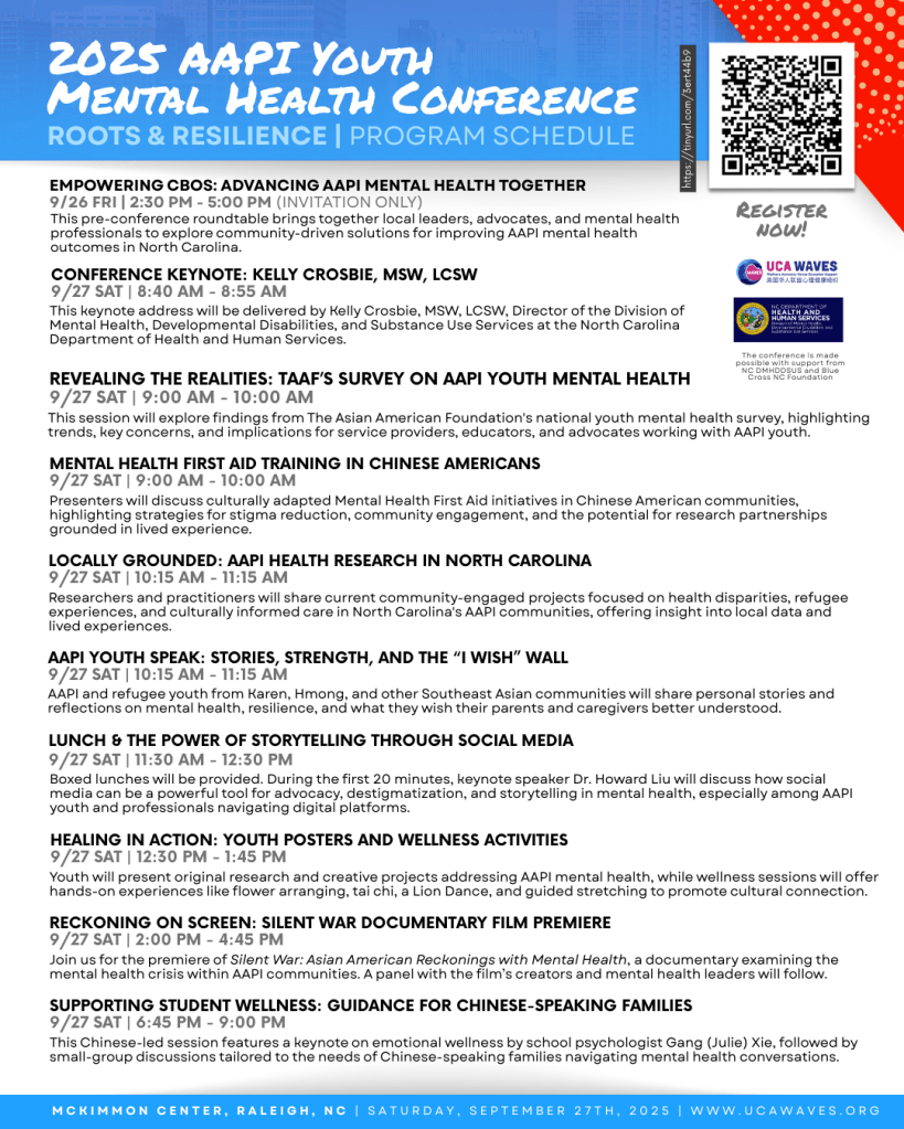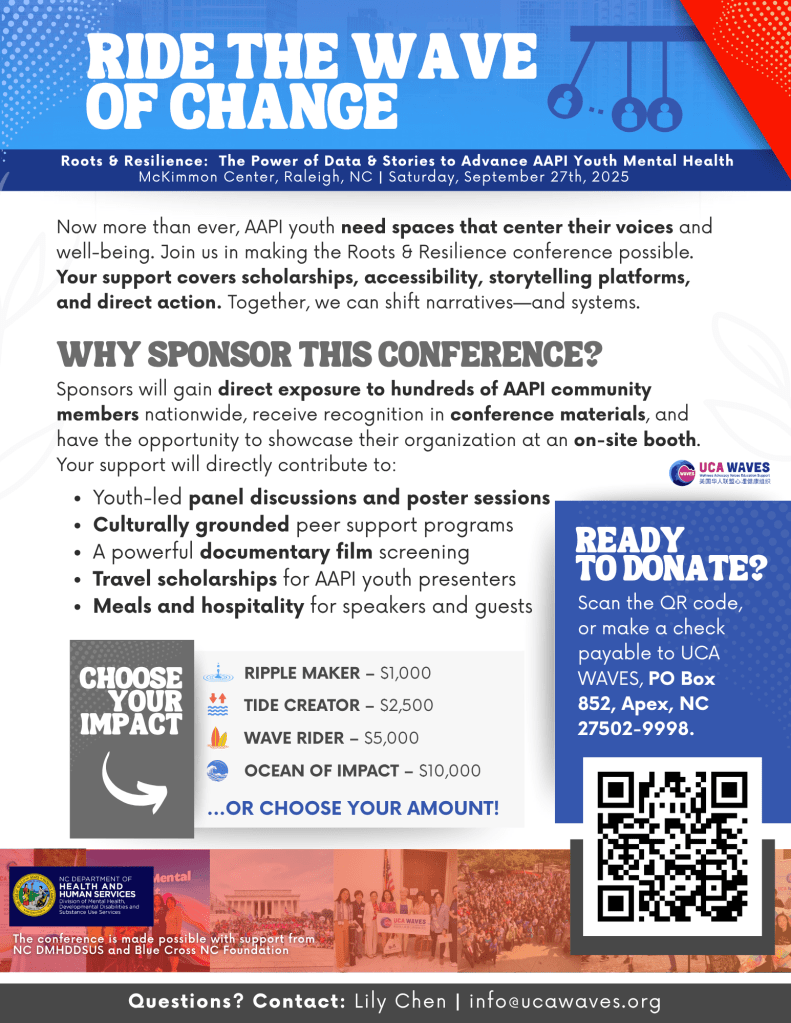 Special thanks to our amazing sponsors who made this event possible: North Carolina DHHS DMHDDSUD, BlueCross and BlueShield of North Carolina Foundation, The Asian American Foundation, Triangle Community Foundation, Julian Grace Foundation, United Chinese Americans Community Foundation, Chinese American Friendship Association, Blue Sails Counseling and Consulting, HealthLit4Wake and Alliance Health. It truly takes a village!