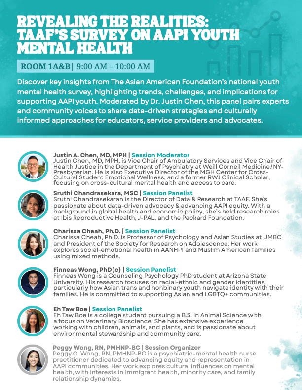 This session will explore findings from The Asian American Foundation’s national youth mental health survey, highlighting trends, key concerns, and implications for service providers, educators, and advocates working with AAPI youth.