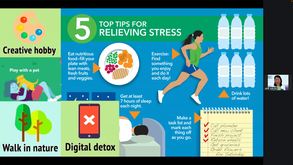 Dr. Xie’s Webinar is an excellent mix of theoretical and practical guidance. For the theoretical part, it will take lifelong learning. But we can put many practical guidance into action right away. For me, I will use the time when I drive back home to put behind what is on my mind about work. I will remember to smile before entering my classroom and home. I will putting a Wellness Bingo in my lab to help my students to be intentional about putting their mental health as a priority.