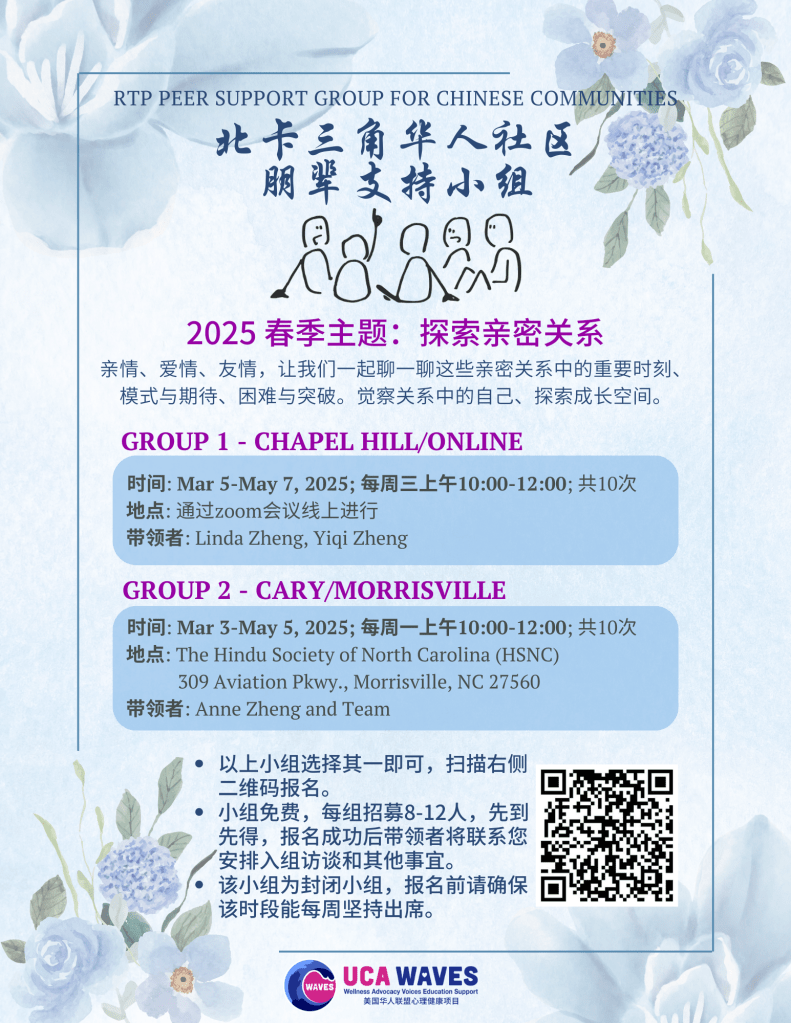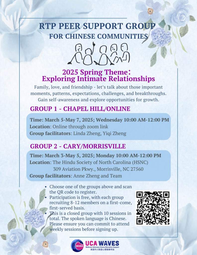 2025 Cary Peer Support Group focuses on the theme of relationships, specifically including relationships with parents, parent-child relationships, intimate relationships, and friendships.