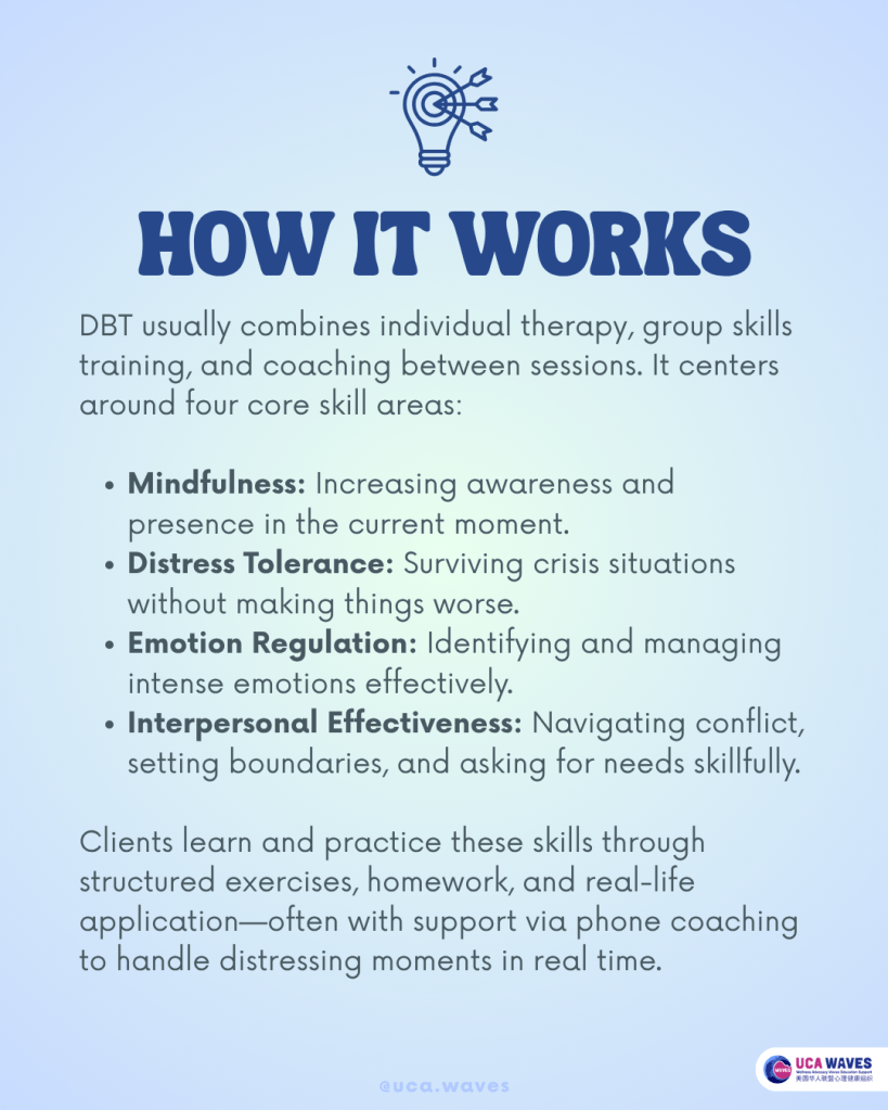 Unlike traditional CBT, DBT places a strong emphasis on emotional regulation, mindfulness, and interpersonal effectiveness, making it especially useful for individuals who experience high emotional sensitivity or relational instability.