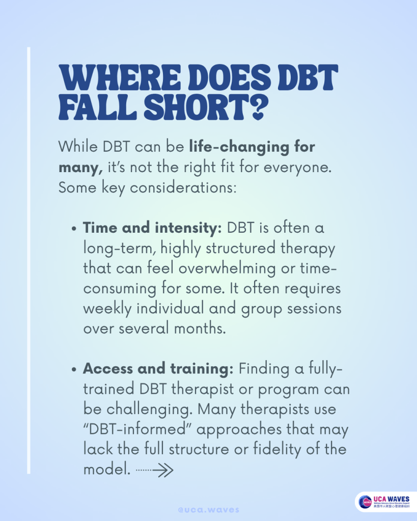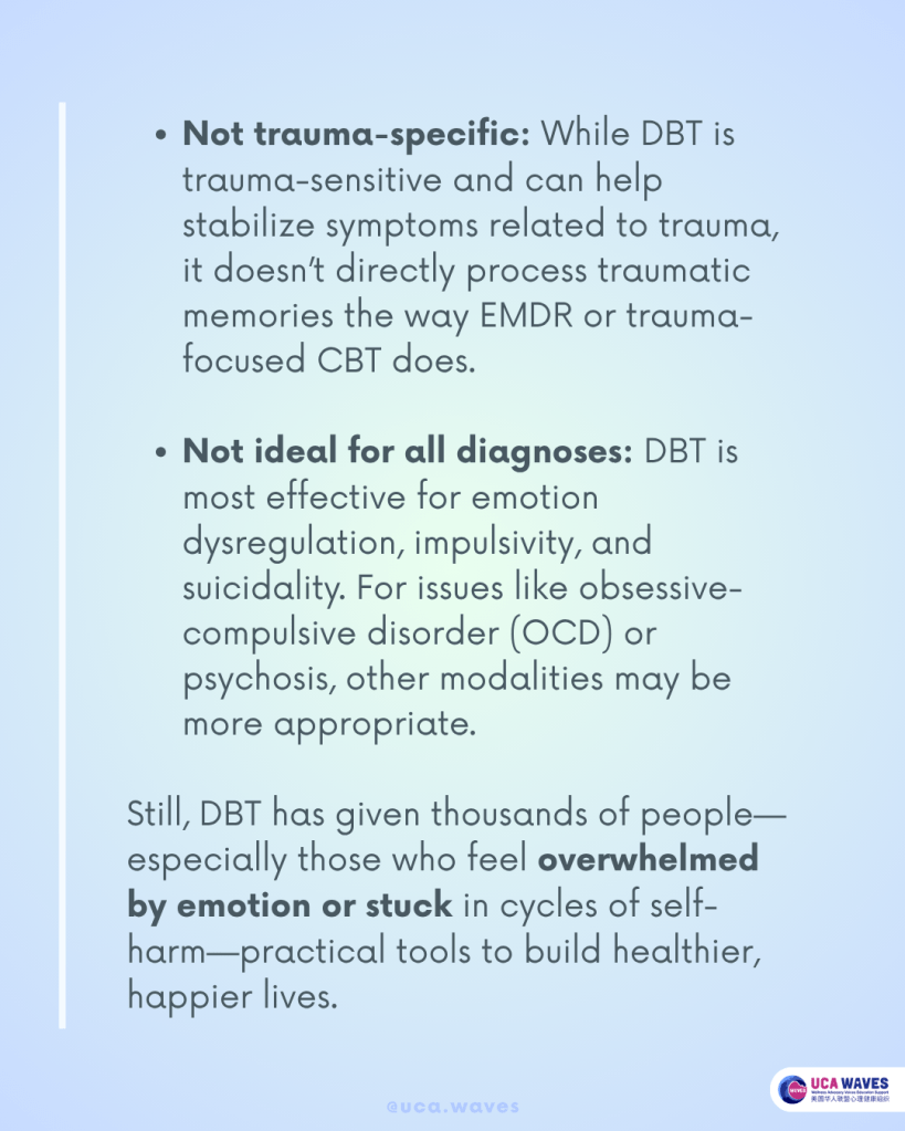 - Not ideal for all diagnoses: DBT is most effective for emotion dysregulation, impulsivity, and suicidality. For issues like obsessive-compulsive disorder (OCD) or psychosis, other modalities may be more appropriate.