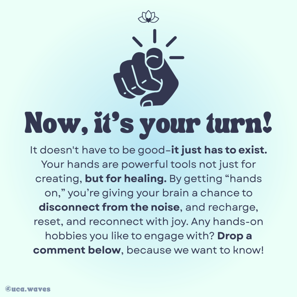 It doesn’t have to be good–it just has to exist. Your hands are powerful tools not just for creating, but for healing. By getting “hands-on,” you’re giving your brain a chance to disconnect from the noise, and recharge, reset, and reconnect with joy. Any hands-on hobbies you like to engage with? Drop a comment below, because we want to know! ⬇️