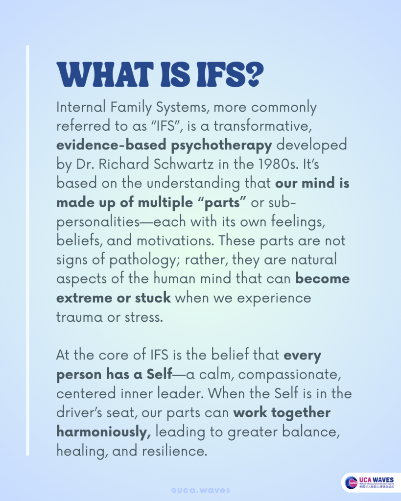 IFS is a transformative, evidence-based psychotherapy developed by Dr. Richard Schwartz in the 1980s. It’s based on the understanding that our mind is made up of multiple “parts” or sub-personalities—each with its own feelings, beliefs, and motivations. These parts are not signs of pathology; rather, they are natural aspects of the human mind that can become extreme or stuck when we experience trauma or stress.
