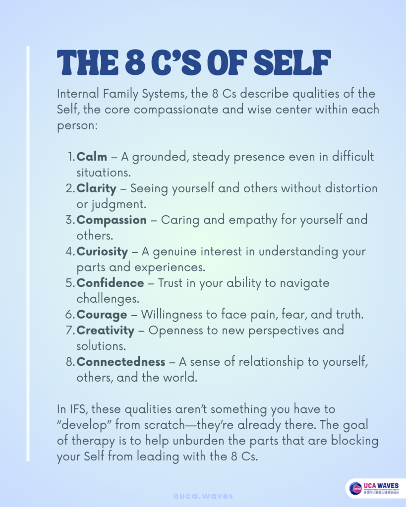 The therapist helps the client access their Self and then gently connect with and heal these parts—particularly exiles—by unburdening them from the extreme roles they’ve taken on.The goal of therapy is to help unburden the parts that are blocking your Self from leading with the 8 Cs. The Self consists of 8 C’s: calm, clarity, compassion, curiosity, confidence, courage, creativity and connectedness. In IFS, these qualities aren’t something you have to “develop” from scratch—they’re already there!