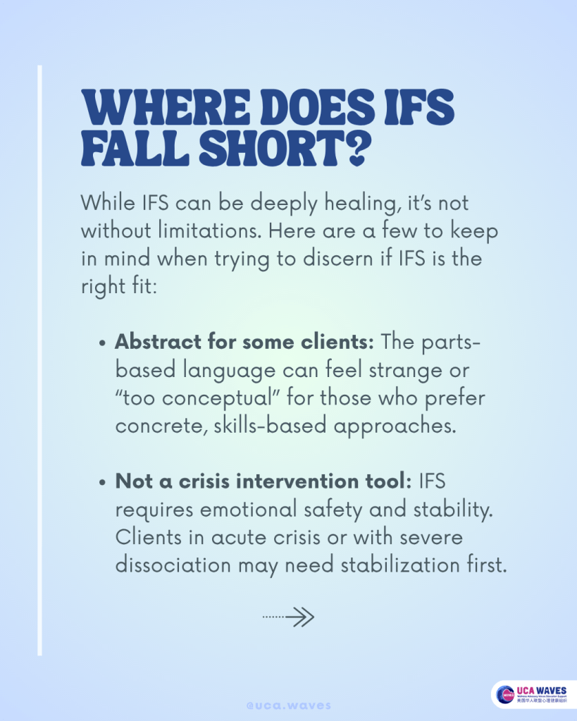 - Not a crisis intervention tool: IFS requires emotional safety and stability. Clients in acute crisis or with severe dissociation may need stabilization first.