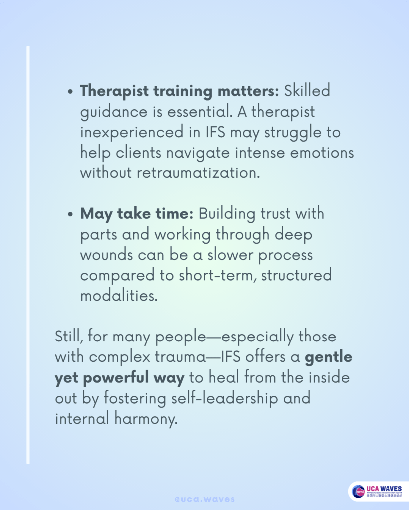 - Therapist training matters: Skilled guidance is essential. A therapist inexperienced in IFS may struggle to help clients navigate intense emotions without retraumatization.