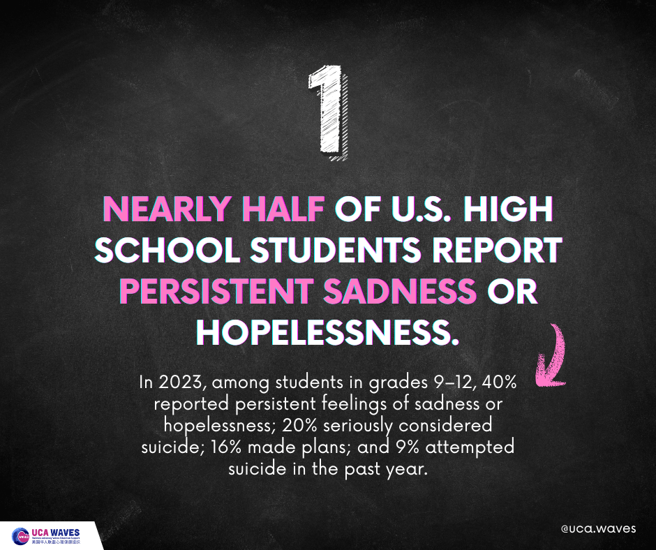 1️⃣ Nearly half of U.S. highcschool students report persistent sadness or hopelessness. In 2023, among students in grades 9–12, 40% reported persistent feelings of sadness or hopelessness; 20% seriously considered suicide; 16% made plans; and 9% attempted suicide in the past year