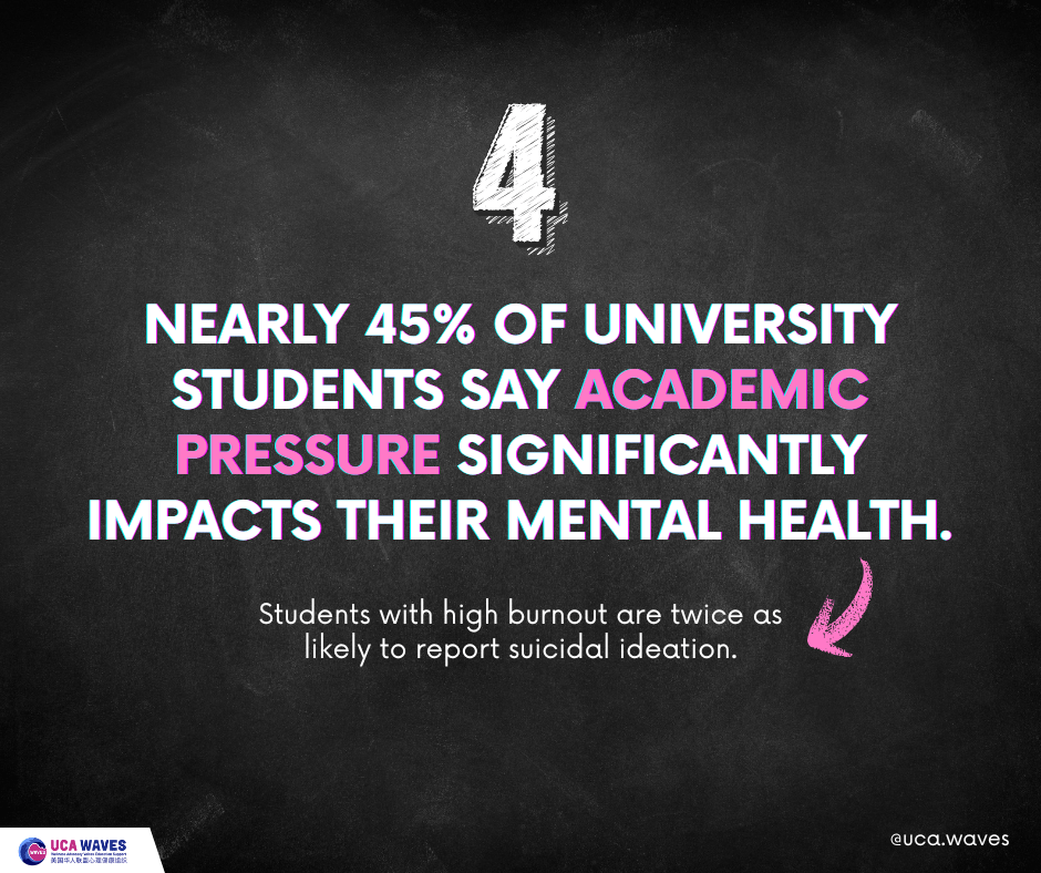 4️⃣ Nearly 45% of university students say academic pressure significantly impacts their mental health. Students with high burnout are twice as likely to report suicidal ideation.