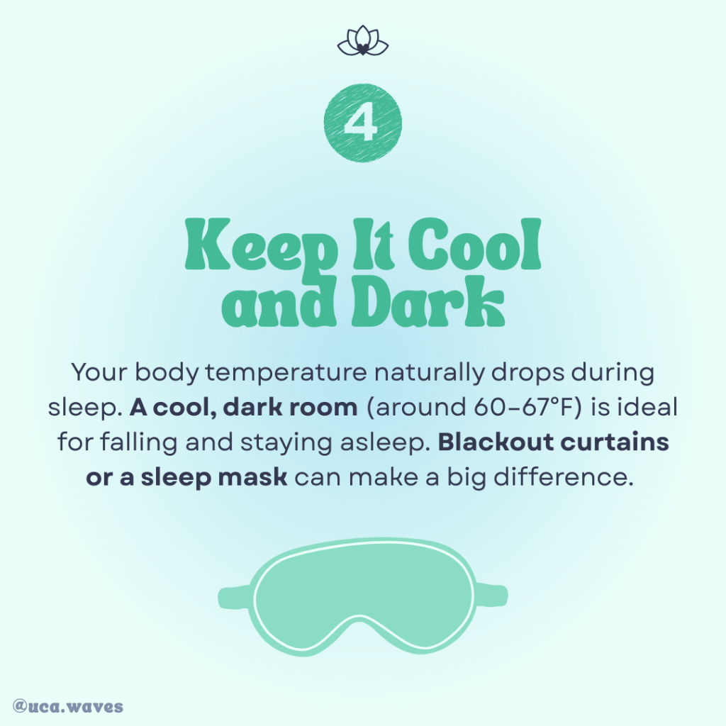 Your body temperature naturally drops during sleep. A cool, dark room (around 60–67°F) is ideal for falling and staying asleep. Blackout curtains or a sleep mask can make a big difference.