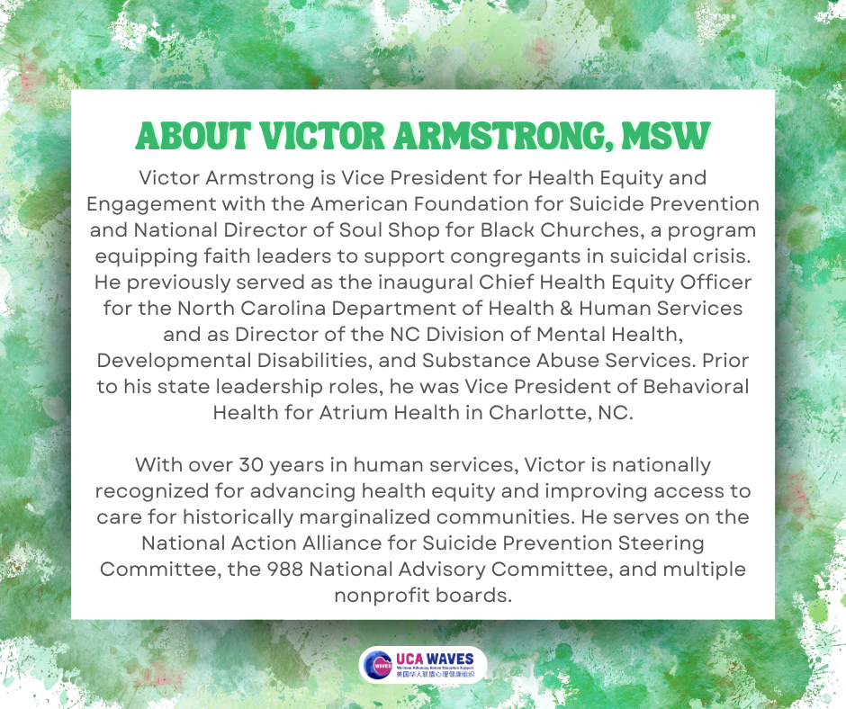 We are honored to welcome Victor Armstrong, MSW, Senior Vice President at the American Foundation for Suicide Prevention, as a keynote speaker at the 2025 AAPI Youth Mental Health Conference.