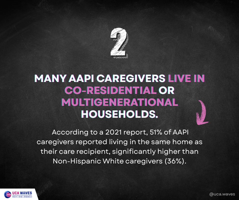 2️⃣ Many AAPI caregivers live in co-residential or multigenerational households. According to a 2021 report, 51% of AAPI caregivers reported living in the same home as their care recipient, significantly higher than Non-Hispanic White caregivers (36%).