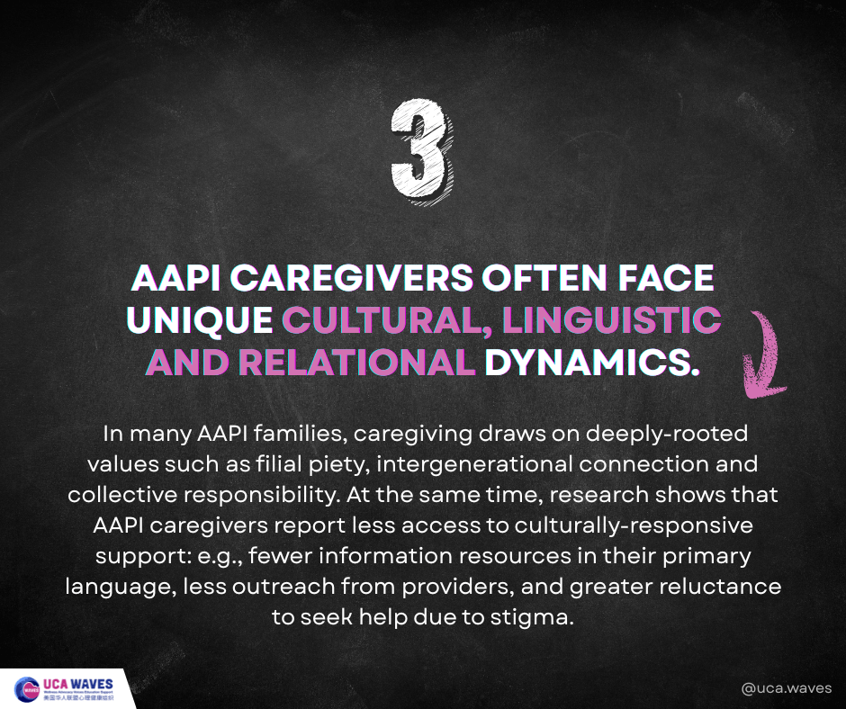 3️⃣ AAPI caregivers often face unique cultural, linguistic and relational dynamics. In many AAPI families, caregiving draws on deeply-rooted values such as filial piety, intergenerational connection and collective responsibility. At the same time, research shows that AAPI caregivers report less access to culturally-responsive support: e.g., fewer information resources in their primary language, less outreach from providers, and greater reluctance to seek help due to stigma.