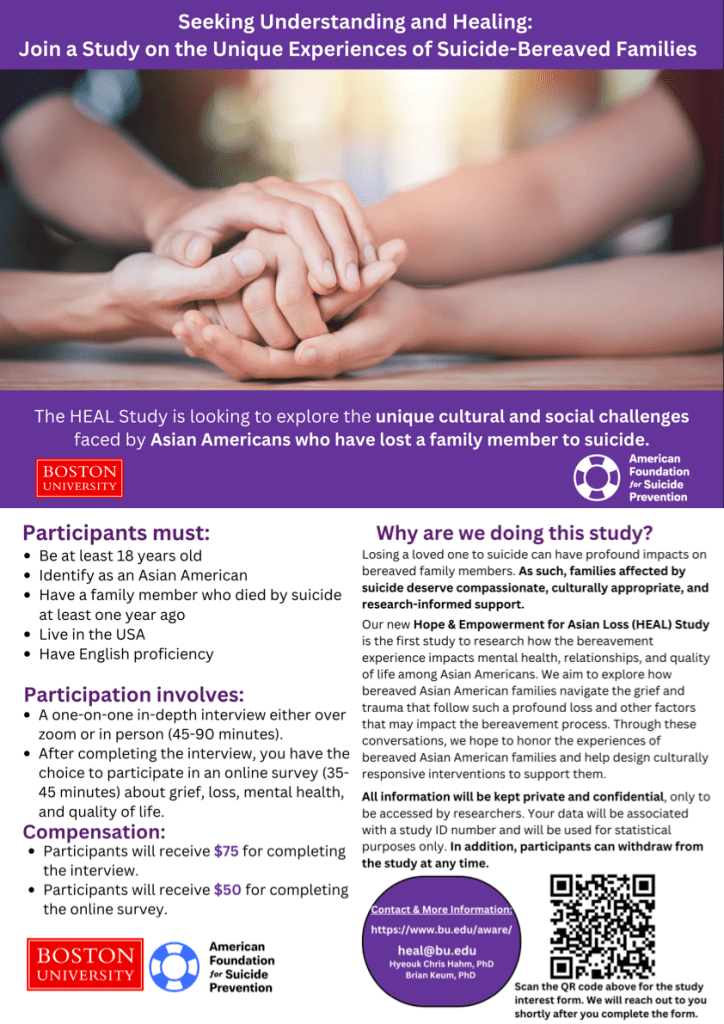 Brought to you by Boston University and American Foundation for Suicide Prevention, The HEAL Study is a research project aims to explore the unique cultural and social challenges faced by Asian Americans who have lost a family member to suicide.