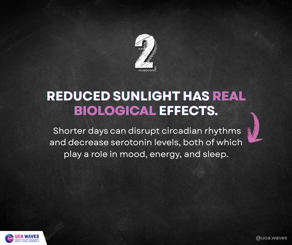 Shorter days can disrupt circadian rhythms and decrease serotonin levels, both of which play a role in mood, energy, and sleep.