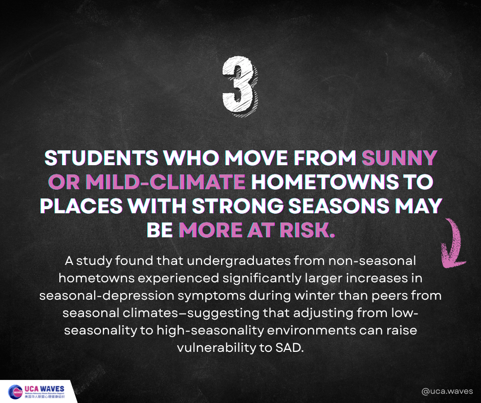 3️⃣ Students who move from sunny or mild-climate hometowns to places with strong seasons may be more at risk.