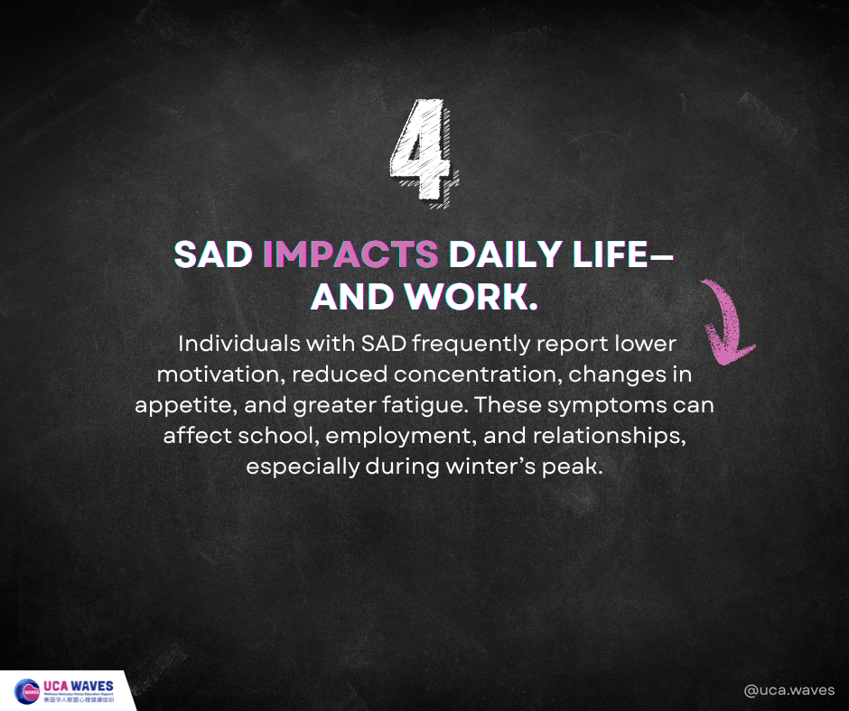 Individuals with SAD frequently report lower motivation, reduced concentration, changes in appetite, and greater fatigue. These symptoms can affect school, employment, and relationships, especially during winter’s peak.