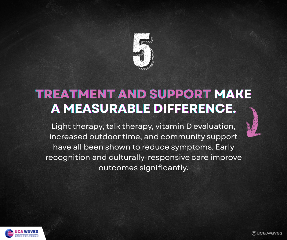Light therapy, talk therapy, vitamin D evaluation, increased outdoor time, and community support have all been shown to reduce symptoms. Early recognition and culturally-responsive care improve outcomes significantly.