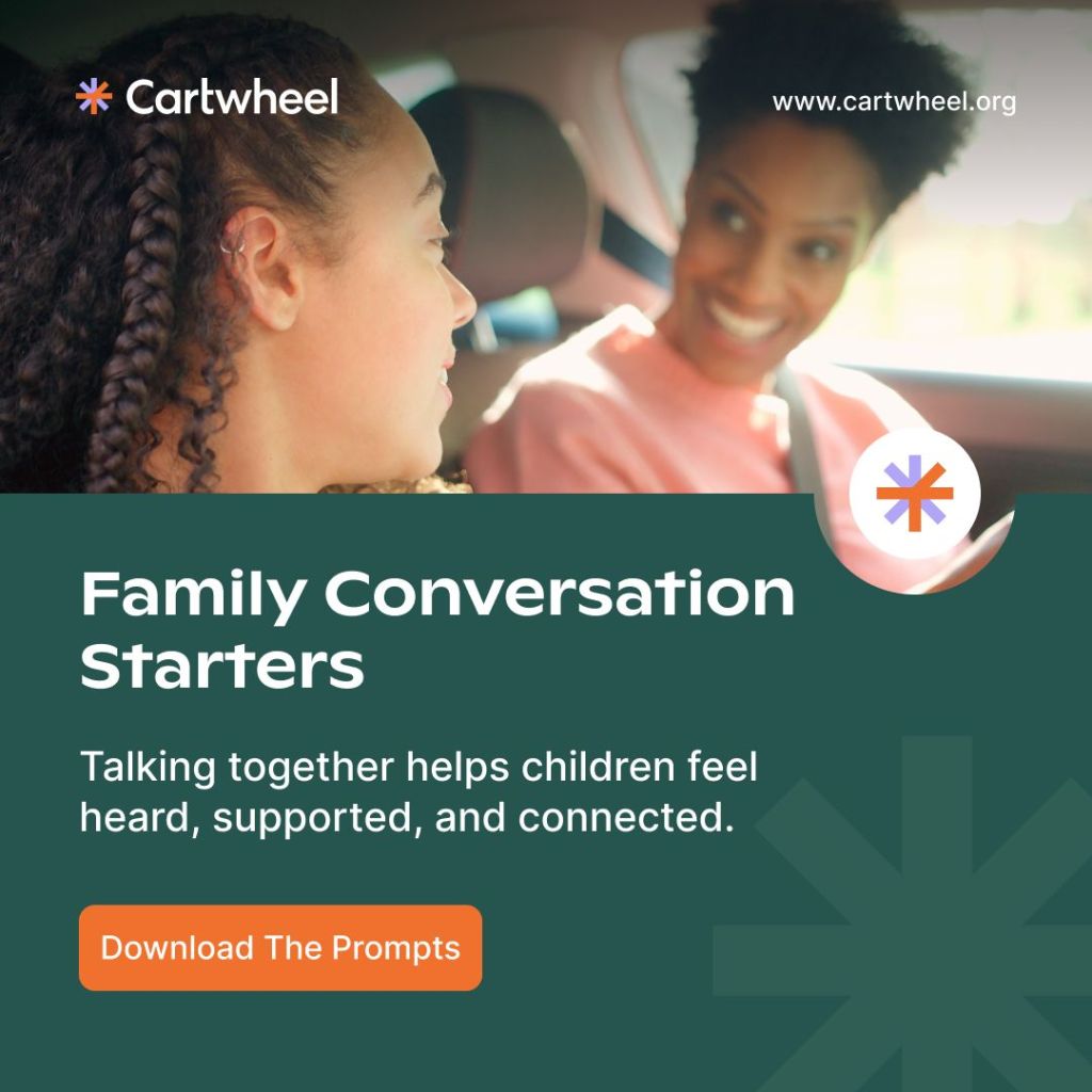 This free resource from Cartwheel offers Family Conversation Starters designed to help children feel heard, supported, and emotionally safe. From quick “Highs & Lows” check-ins to deeper questions that invite reflection, these prompts help create space for meaningful connection.