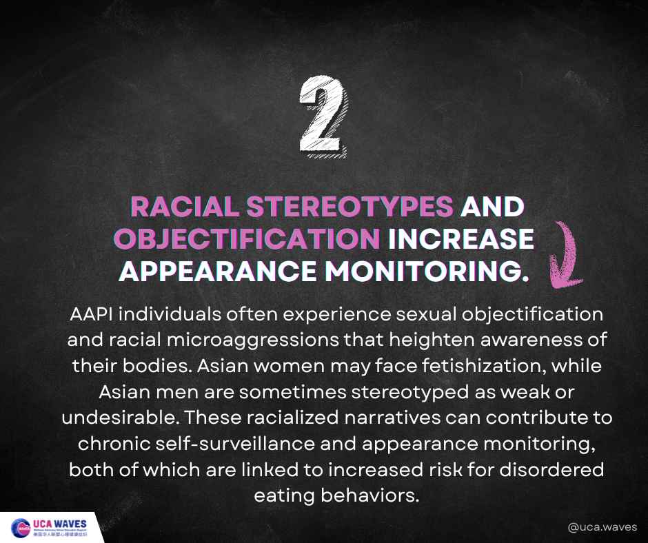 AAPI individuals often experience sexual objectification and racial microaggressions that heighten awareness of their bodies. Asian women may face fetishization, while Asian men are sometimes stereotyped as weak or undesirable. These racialized narratives can contribute to chronic self-surveillance and appearance monitoring, both of which are linked to increased risk for disordered eating behaviors.