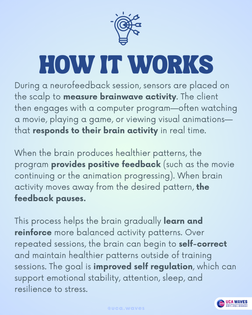 Over repeated sessions, the brain can begin to self-correct and maintain healthier patterns outside of training sessions. The goal is improved self regulation, which can support emotional stability, attention, sleep, and resilience to stress.