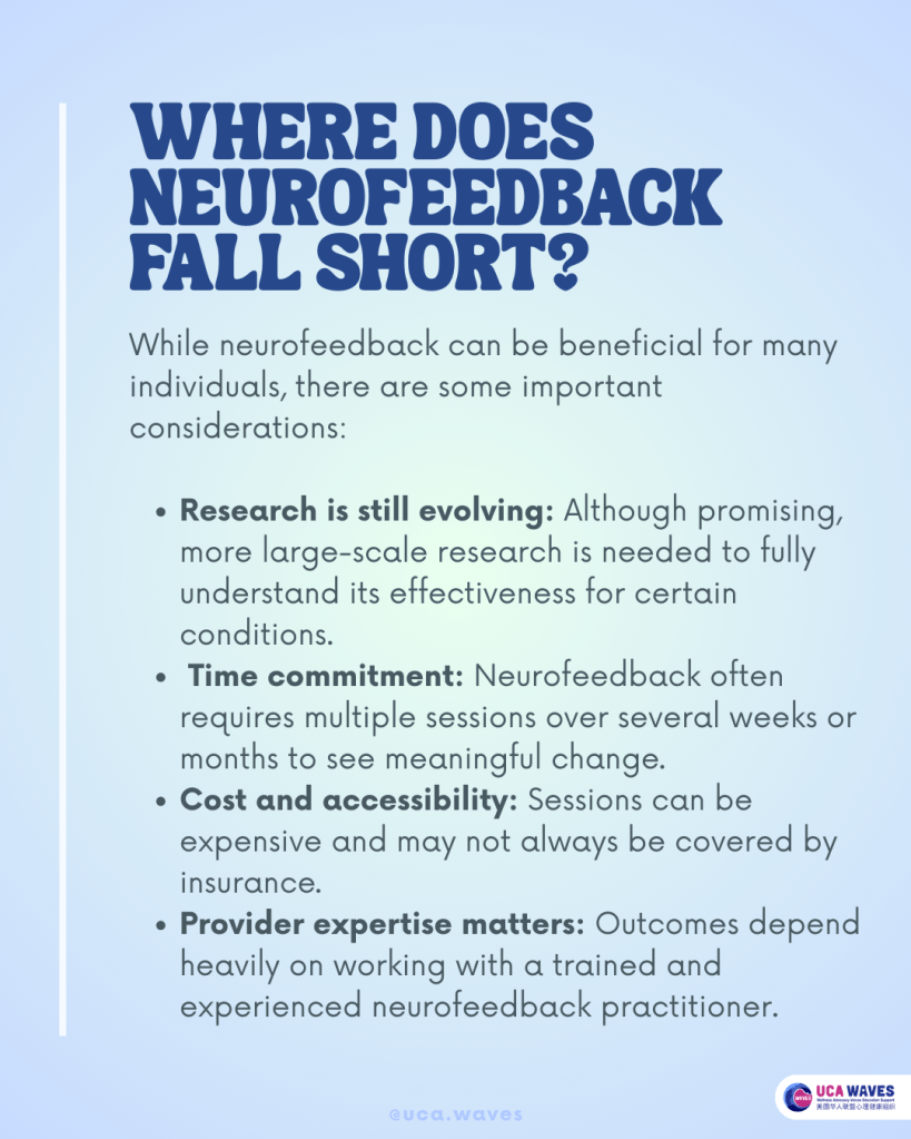 - Provider expertise matters: Outcomes depend heavily on working with a trained and experienced neurofeedback practitioner.