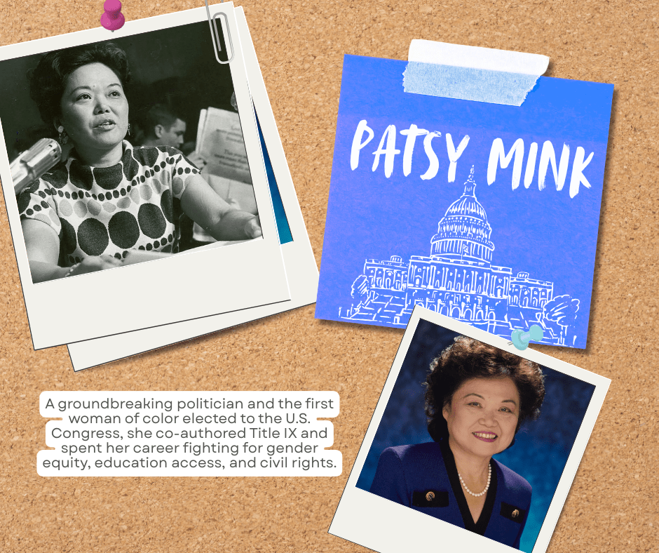 - Patsy Mink: A groundbreaking politician and the first woman of color elected to the U.S. Congress, she co-authored Title IX and spent her career fighting for gender equity, education access, and civil rights.