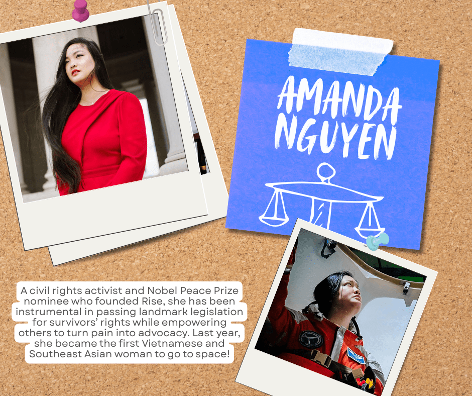 - Amanda Nguyen: A civil rights activist and Nobel Peace Prize nominee who founded Rise, she has been instrumental in passing landmark legislation for survivors’ rights while empowering others to turn pain into advocacy. Last year, she became the first Vietnamese and Southeast Asian woman to go to space!