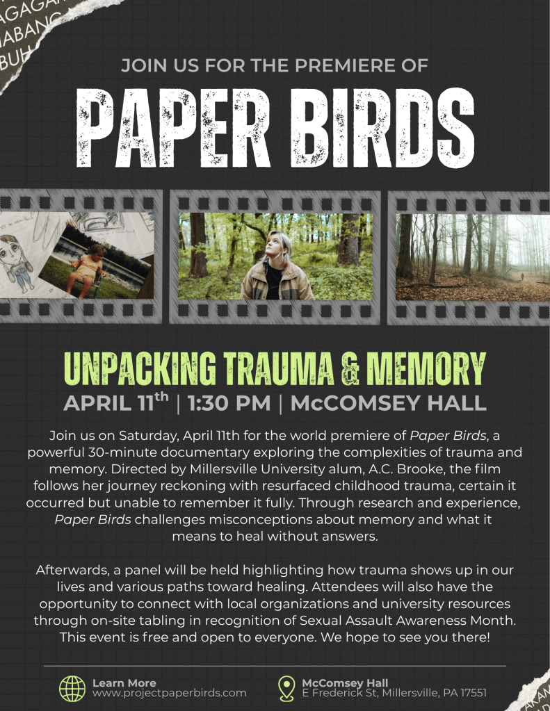 This Saturday, April 11th, our very own creative director Alli will premiere her film at Millersville University in observation of Sexual Assault Awareness Month. The documentary, titled Paper Birds, is a 30-minute piece exploring the complexities of trauma and memory and the delayed onset of PTSD. Following her own journey grappling with recovered memories, it aims to to illuminate a common but historically stigmatized phenomenon, and demonstrate that you can heal even in the absence of answers.