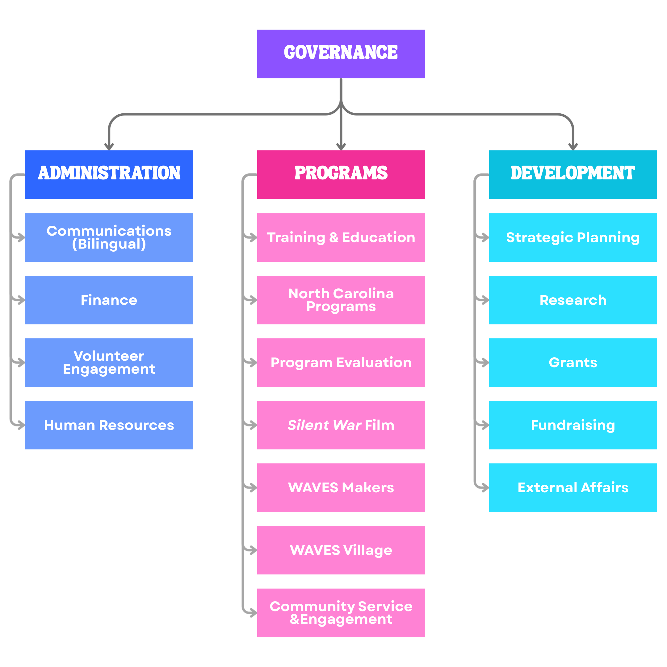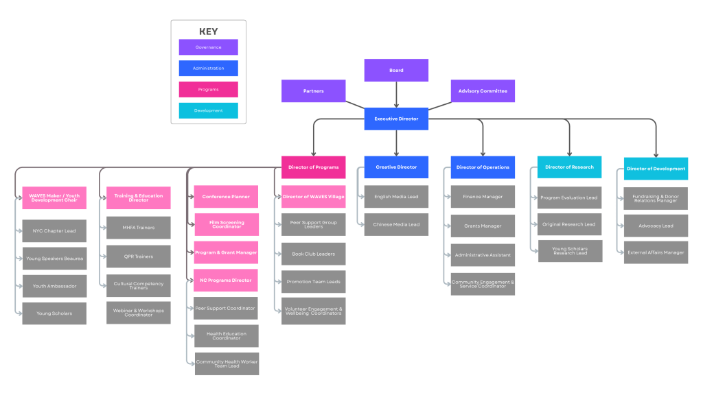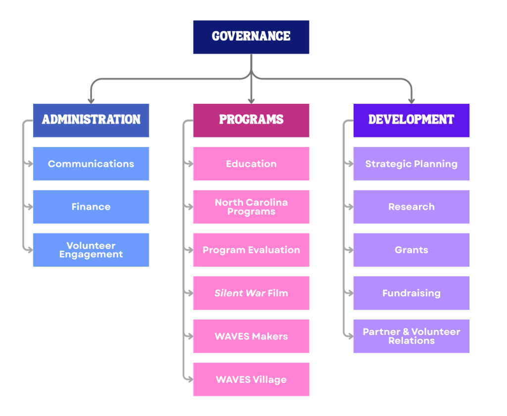 Our organizational structure is designed to support both strong internal operations and meaningful external impact. It is organized into four interconnected areas—Governance, Administration, Programs, and Development—each with distinct roles that work together to advance our mission. Governance provides oversight and strategic guidance; Administration ensures effective internal management and compliance; Programs carry out our direct community-facing work; and Development builds the resources, partnerships, and long-term capacity needed for sustainable growth. Together, these branches create a cohesive framework that supports accountability, impact, and organizational resilience. You can read a bit more about each respective branch below!