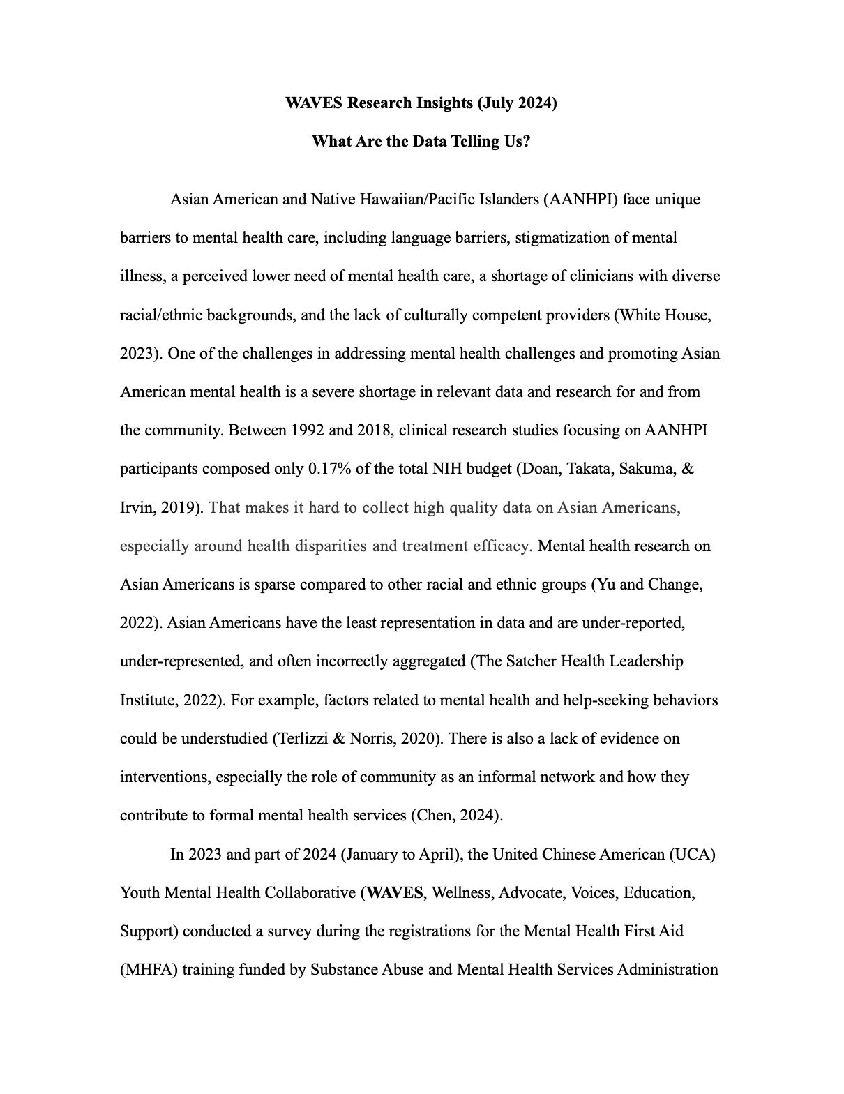 One of the challenges in addressing and promoting Asian American mental health is the severe shortage of relevant data and research for and from the community. To echo the notion of “Nothing about us without us”, WAVES will keep studying and publishing data-driven Research Insights to provide empirical evidence on the effectiveness of MHFA training and other data storytelling to facilitate our understanding of mental health in our community.