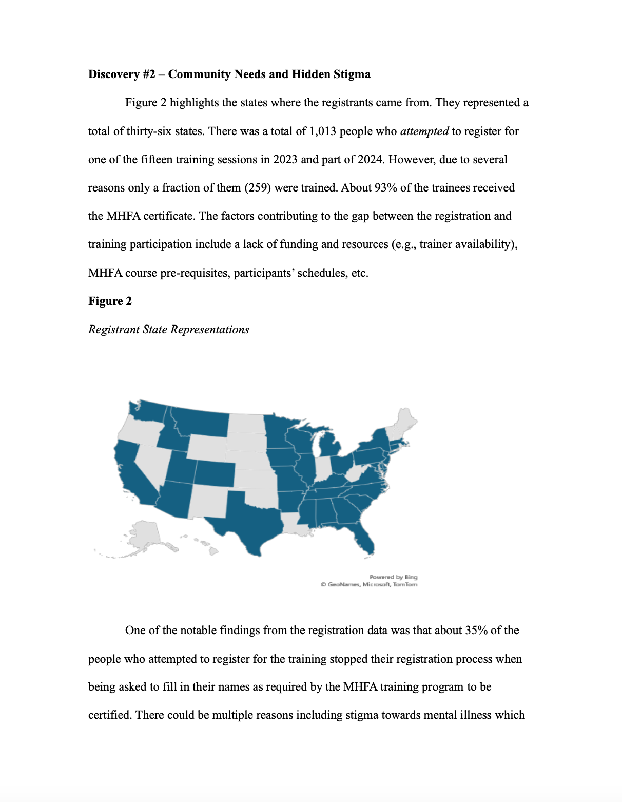 In that report, we used our own data collected in 2023 and a part of 2024 (January – April) during the registrations for the Mental Health First Aid (MHFA) training funded by the Substance Abuse and Mental Health Services Administration (SAMHSA).