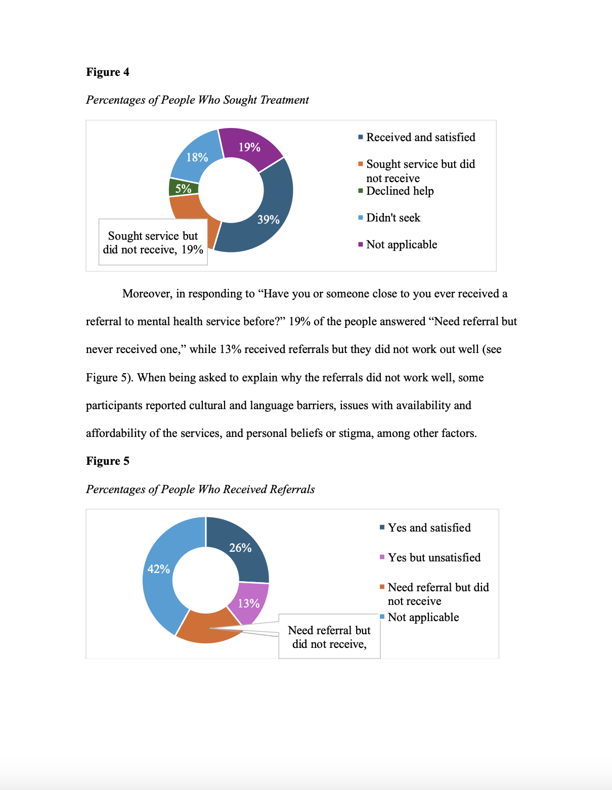 The preliminary findings indicated a great need in our community for mental health education and services as well as hidden stigma among our members and accessibility challenges. community outreach.